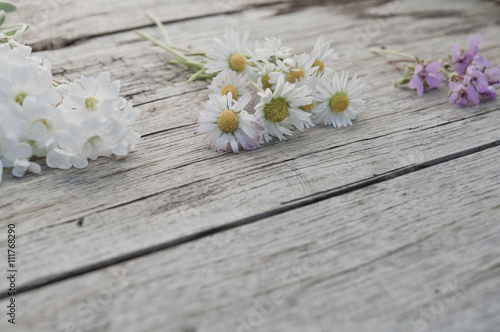 Fototapeta premium Small bunches of flowers on wooden background copy space