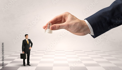 Fototapeta premium Small businessman fighting against big chessman on a big hand with chess board concept