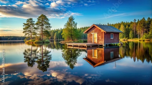 © Kingphet, Fototapeta premium Small cabin on lake in Sweden