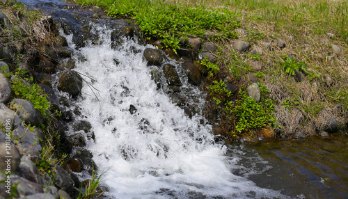 Naklejka premium Small canal with Cherry blossoms in full bloom, Natural and Cultural Gardens, The Expo 70 Commemorative Park, Osaka, Japan