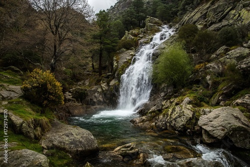 © inas, Naklejka premium Small cascading waterfalls flowing into clear green pool surrounded by lush vegetation and rocky landscape in serene forest setting.