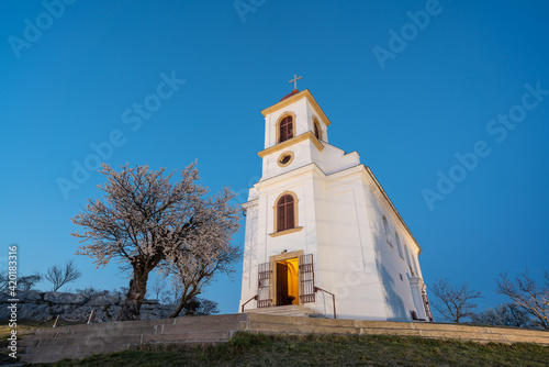 © Csák István, Fototapeta premium Small chapel with almond tree