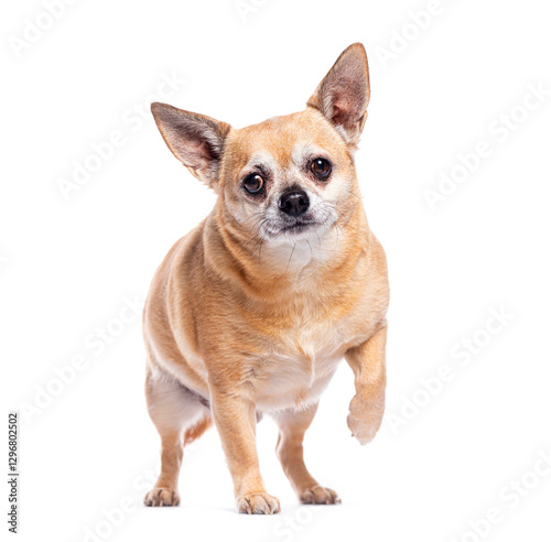 Obraz premium Small chihuahua dog standing on white background raising paw