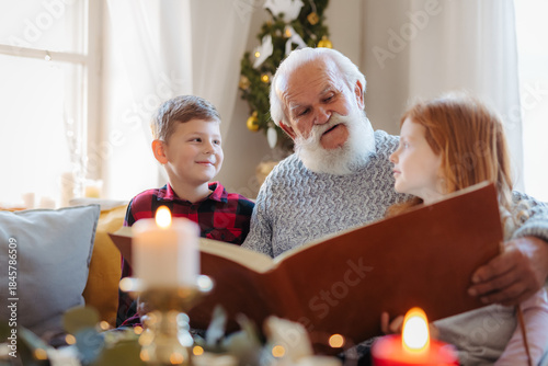 © Halfpoint, Obraz premium Small children with senior grandfather indoors at home at Christmas, looking at photographs.