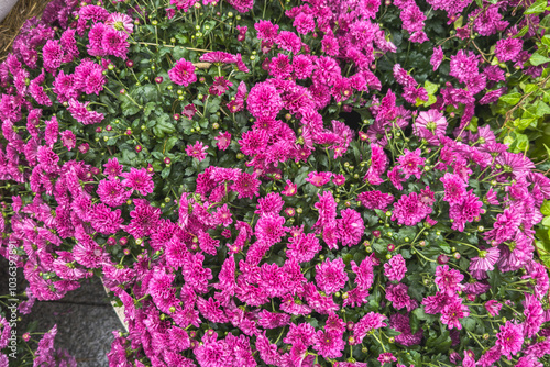 © Natalia, Fototapeta premium Small chrysanthemums in a flowerpot close-up. Autumn arrangement.