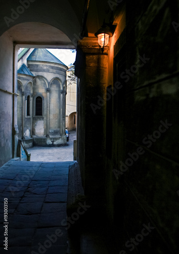© alkiona_25, Fototapeta premium Small Church in Yard out off Dark Porch Lantern on Wall