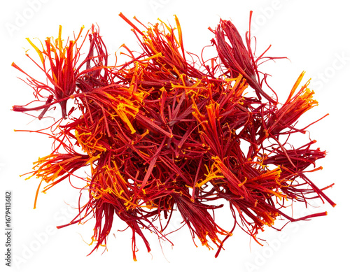 © MstSultanaAkter, Naklejka premium Small Cluster of Saffron Pistils, Top-Down View, Isolated on White Background
