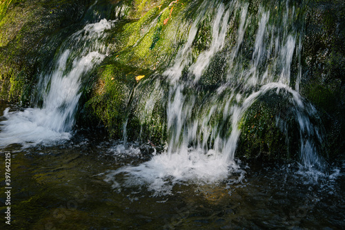 © Koirill, Naklejka premium Small cozy waterfall in forest on sunny day. Mountain river falls from cliff onto rocks, rushing stream of water.