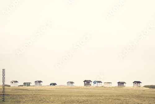 Obraz premium Small cute beach huts in a row at the shoreline on the horizon