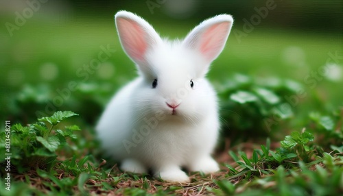 Fototapeta premium small cute fluffy white bunny with pink ears sitting amidst greenery garden