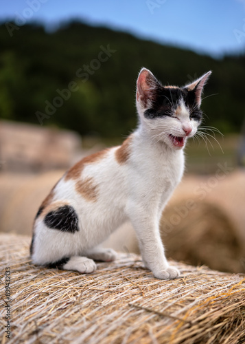 © Lubo Ivanko, Fototapeta premium Small cute kitten sitting on hay roll, yawning looks like it's smiling