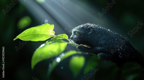 © Giman, Obraz premium Small, dark primate on lush foliage, bathed in sunlight