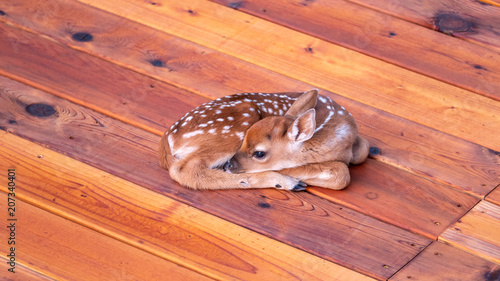 © porqueno, Fototapeta premium Small Deer Fawn Resting on Cedar Wood Deck