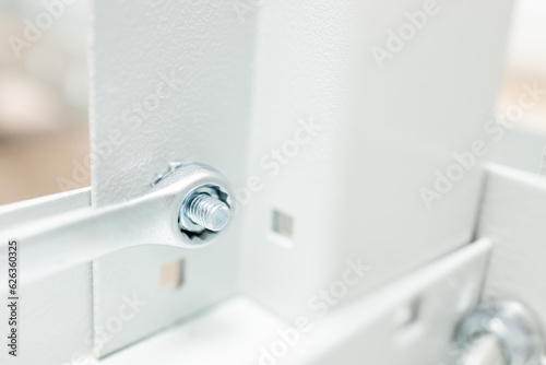 Obraz premium small depth of field on the wrench at the moment of tightening the nut on the metal rack