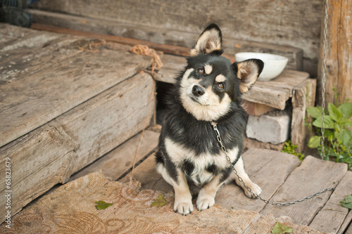 Fototapeta premium Small dog on a chain.Small dog on a chain.