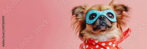 © BerkahStock, Fototapeta premium Small dog wearing mask and red bandana on pink background.
