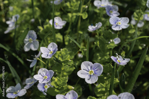 © Jurii, Obraz premium small dove flowers in green grass, background, early spring, greenery