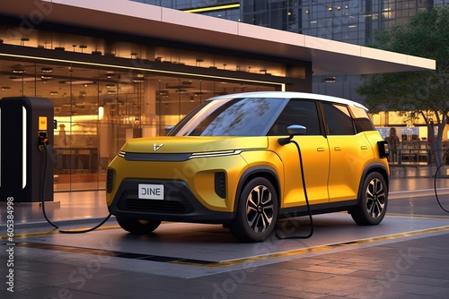 Fototapeta premium small electric car mini EV style charging at station in the city or countryside