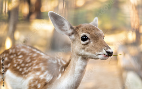 © 22Imagesstudio, Fototapeta premium Small fallow deer at woodland during sunset