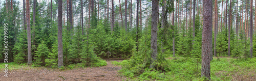 Fototapeta premium small firs and old pines dark forest