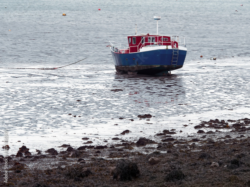 Naklejka premium Small fishing boat at low tide by a shore. Blue and red color of the vessel. Calm water surface.