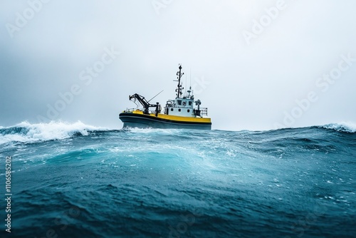 © zakiroff, Naklejka premium Small fishing boat bravely sails through rough seas with big waves during a storm, facing the power of nature in a daring adventure