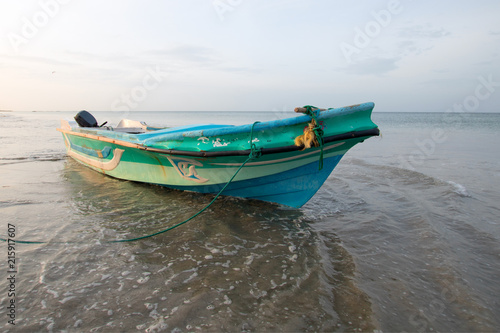 Fototapeta premium Small fishing boat in early sunset light on Nilaveli beach in Trincomalee Sri Lanka Asia