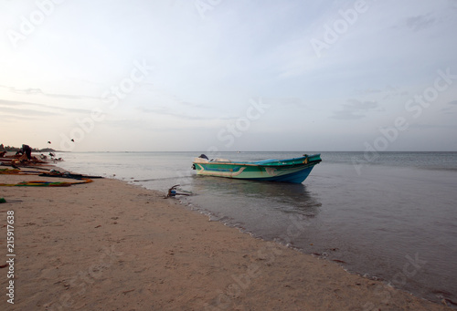 Fototapeta premium Small fishing boat on shore at sunset on Nilaveli beach in Trincomalee Sri...