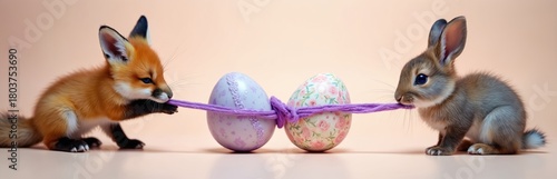 © miss irine, Obraz premium Small fox cub and bunny rabbit playfully tug on decorative Easter eggs with purple rope. Animals compete for colorful eggs in a fun game creating sweet spring holiday scene.