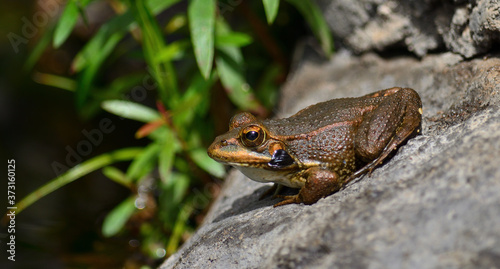 Fototapeta premium Small frog on a rock and sunbathing on the shore of the pond