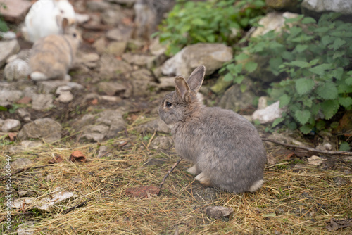 Fototapeta premium small furry rabbits pacing in the ground of a farm
