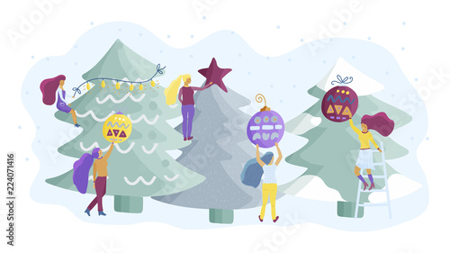 Obraz premium Small girl characters decorate Christmas tree. Flat style vector illustration.