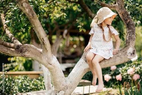 © Ananass, Fototapeta premium Small girl climb tree in summer garden, activity. Little girl on tree branch, childhood. Vacation, activity, lifestyle. Kid fashion, style, beauty Childhood youth growth
