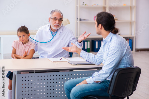 Fototapeta premium Small girl with her father visiting old male doctor