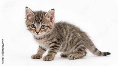 © AkuAku, Obraz premium Small gray cat with stripes on a white surface