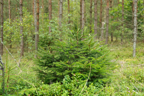 © Nadiia, Fototapeta premium small green fir trees grow in a bush in the forest