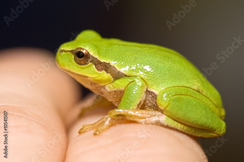© Szasz-Fabian Jozsef, Obraz premium Small green frog sitting on man's hand