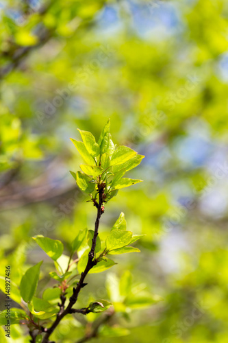 Naklejka premium Small green leaves on a tree in spring