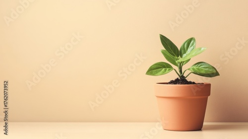 © Yana, Fototapeta premium Small green plant growing in a terracotta pot on a light background in a cozy indoor setting