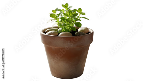 Obraz premium Small green plant growing in a terracotta pot with pebbles