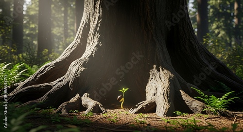 Obraz premium Small Green Seedling Growing at the Base of a Large Tree in a Sunlit Forest