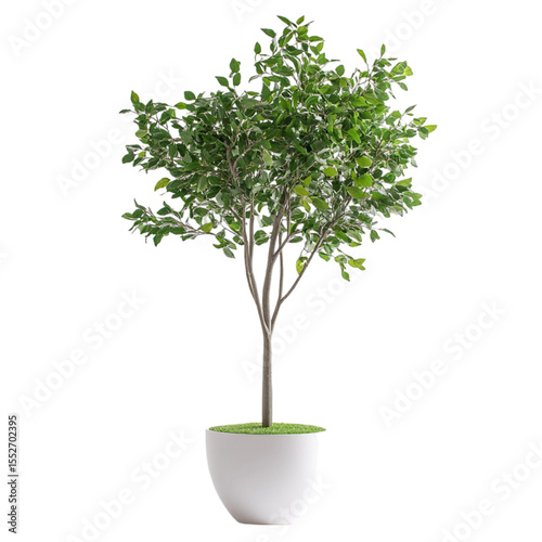 © Tohamina, Fototapeta premium Small green tree in white pot against abstract background