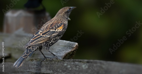 © Wirestock, Fototapeta premium Small grey red-shouldered black troupial (Agelaius phoeniceus) perched atop a fence