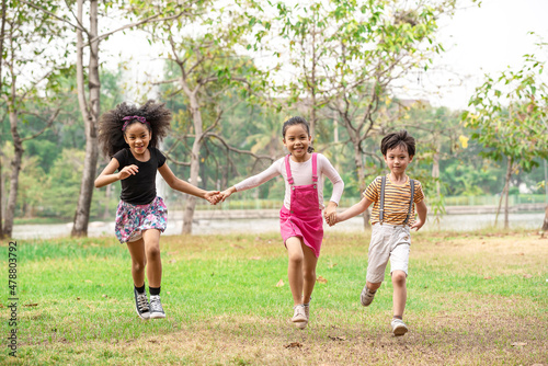 © rachaphak, Obraz premium Small group of a happy children run through the park in the background of grass and trees. Children's outdoor games, vacations, weekend, Children's Day