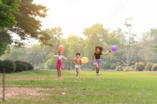 © rachaphak, Fototapeta premium Small group of a happy children run through the park in the background of grass and trees. Children's outdoor games, vacations, weekend, Children's Day