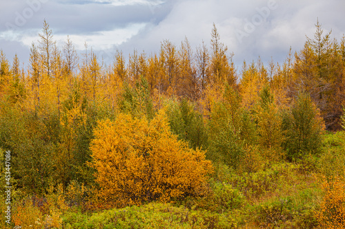 Fototapeta premium Small group of birch and larch trees in autumn colors