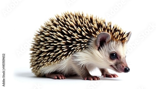 Fototapeta premium Small hedgehog, curled in a ball, isolated on pure white background, prickly, detail