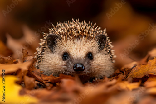 Fototapeta premium Small hedgehog surrounded by autumn leaves in a serene forest setting,...