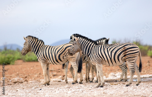 Obraz premium Small herd of Common Zebra standing on the dry Etosha Plains - Namibia