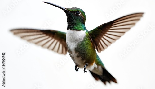 © Maryna, Obraz premium Small hummingbird with wings spread flies mid-air. This tiny bird has green white chest and long beak. It hovers with feathers blurred from motion. It is a wild animal.